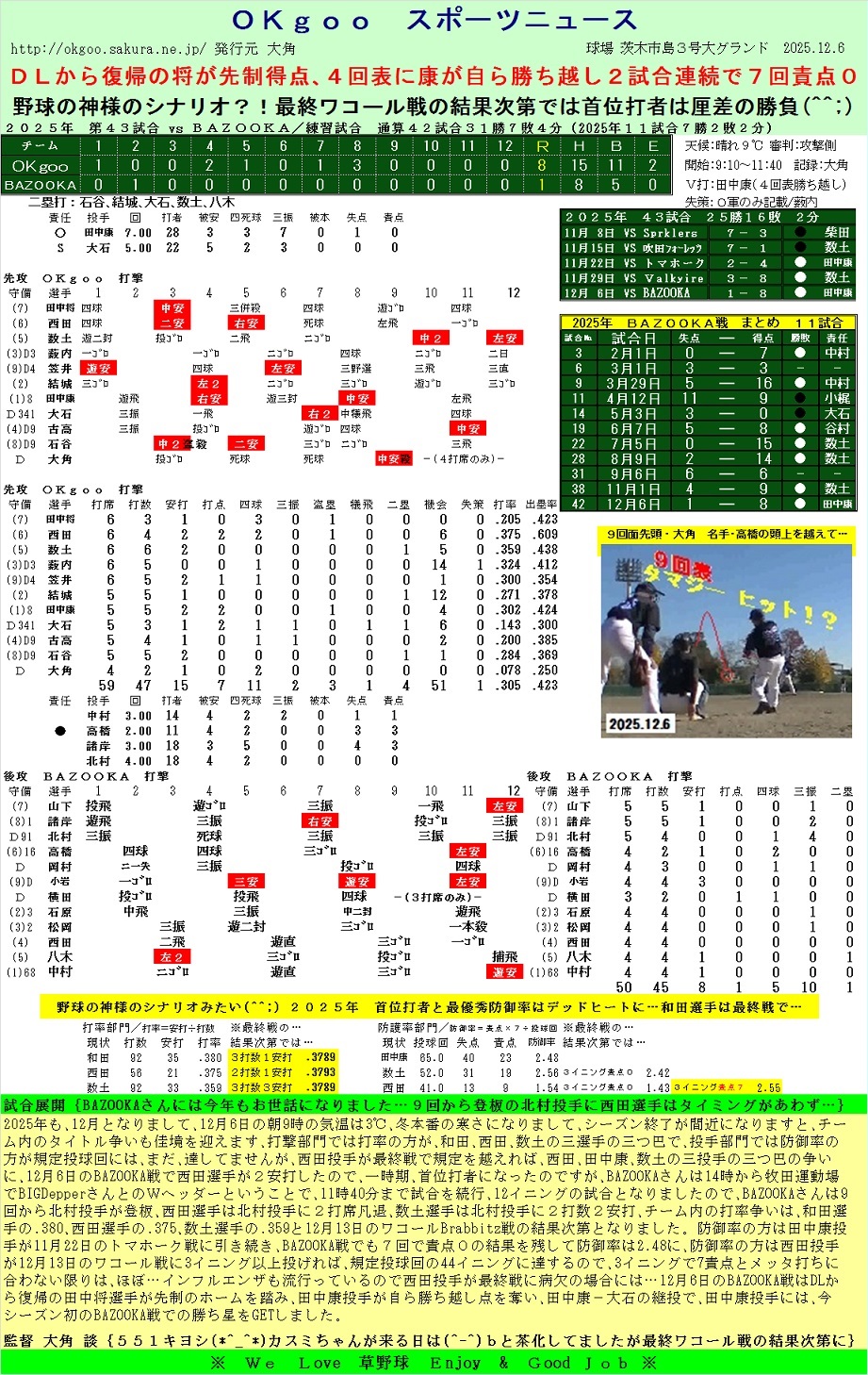 2025 beforeNews 12月6日のBAZOOKA戦、都合により11時40分までの12イニングで試合しました…